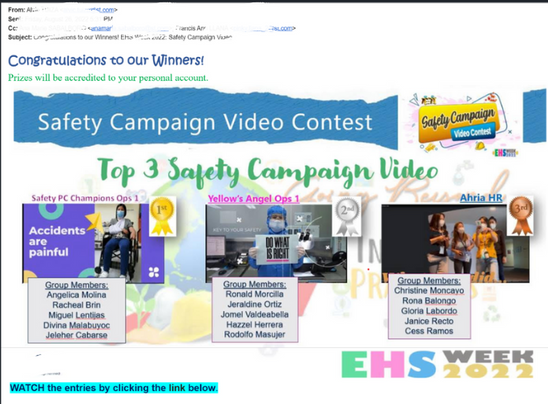 have truly shone through, securing the 1st place out of 18 entries in the ESH Week 2022 Safety Campaign Video Contest. What an incredible accomplishment!